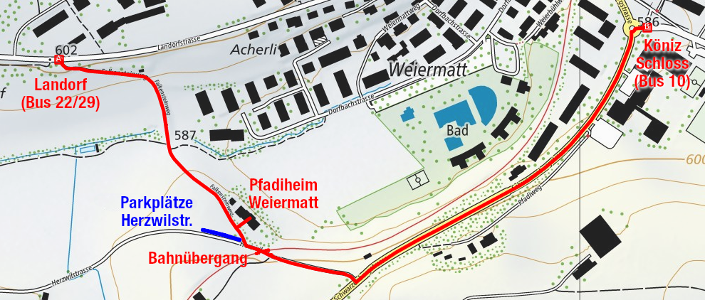 Anreise: Am besten mit öV; ab Bern Bahnhof Buslinie 10 bis Köniz Schloss, dann ca. 15 Minuten Fussweg; ab Köniz Buslinie 22 oder 29 bis Landorf, dann ca. 8 min zu Fuss.
